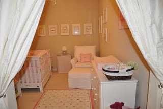 All soft pastels, pretty pink fabrics and white furniture, this has to one of the most elegant baby nurseries ever.
